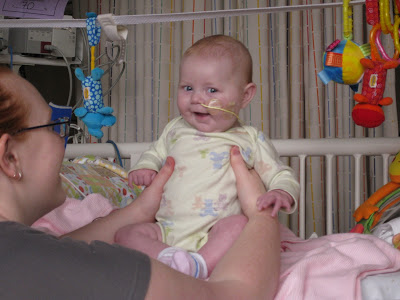 Lillian remained fairly stable for a while after the Milrinone was turned off, but she started getting worse not long after that, spitting up more and giving us other signs. Despite the way things looked, Children's still decided to send us to floor even with Lillian's declining condition, with the expectation that if the decline continued, we would be right back in the CICU. This proved to be correct, as we were back in the CICU after 3 days; brought around by a dramatic show of 6 emesis (spit up/vomiting) in 45 min and a drop in her heart rate into the 80s (normally in the 120s to 160s).